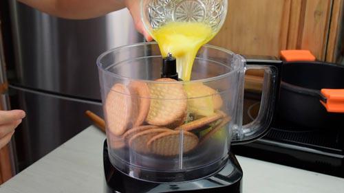 3. Mezcla bien y utiliza esta mezcla para forrar el fondo de un molde desmontable, presionándola de manera uniforme. Luego, coloca el molde en el refrigerador mientras preparamos el relleno.