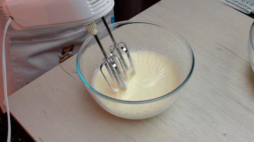 6. En un bol aparte, agrega la nata (crema de leche) para montar (crema de leche) y el azúcar. Bate hasta obtener una consistencia semimontada, es decir, que forme picos suaves pero no completamente firmes.