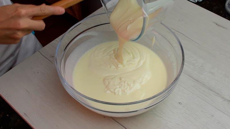 7. Agrega la nata (crema de leche) batida a la mezcla de queso y leche templada. Mezcla con cuidado para integrar todos los ingredientes de manera uniforme.
