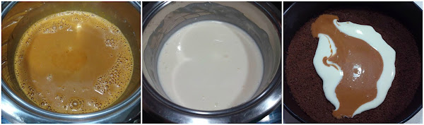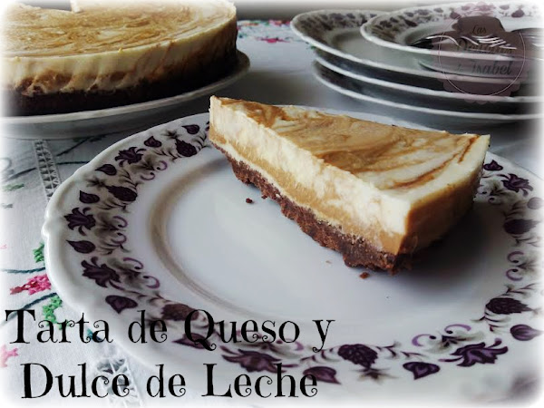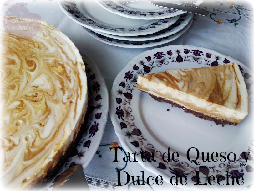 Mientras tanto, ponemos a remojo las hojas de gelatina en dos cuencos (3 en uno y 3 en otro). En un cazo, ponemos 250 ml nata (crema de leche) con el azúcar y el queso y en otro cazo el dulce de leche y el resto de la nata (crema de leche). Lo llevamos al fuego y cuando comience a hervir apagamos, echamos las hojas de gelatina y removemos bien hasta que la mezcla sea homogénea y no haya grumos. Vertemos con cuidado un cazo de la mezcla de queso, a continuación un cazo con la mezcla de dulce de leche, así hasta acabar con ambas mezclas. Después, con un palillo removemos a placer y guardamos en la nevera un mínimo de 4 horas (aunque está mas rica de un día para otro).