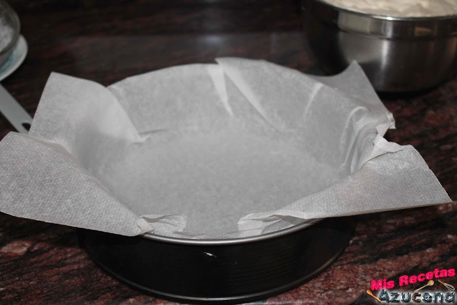 Preparamos un molde de 26 centímetros con papel vegetal, reservamos.