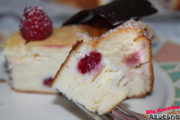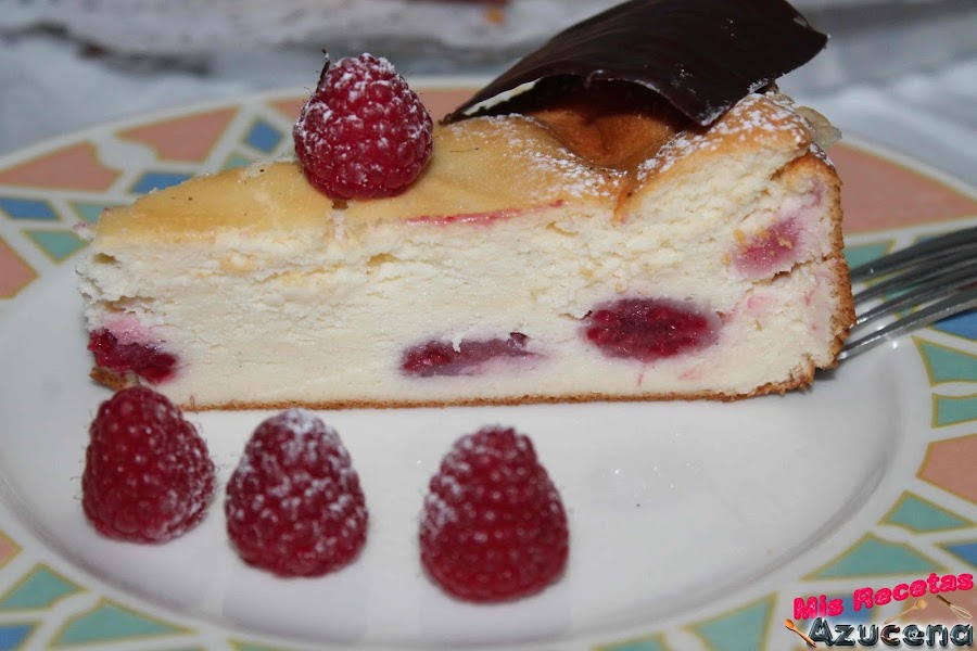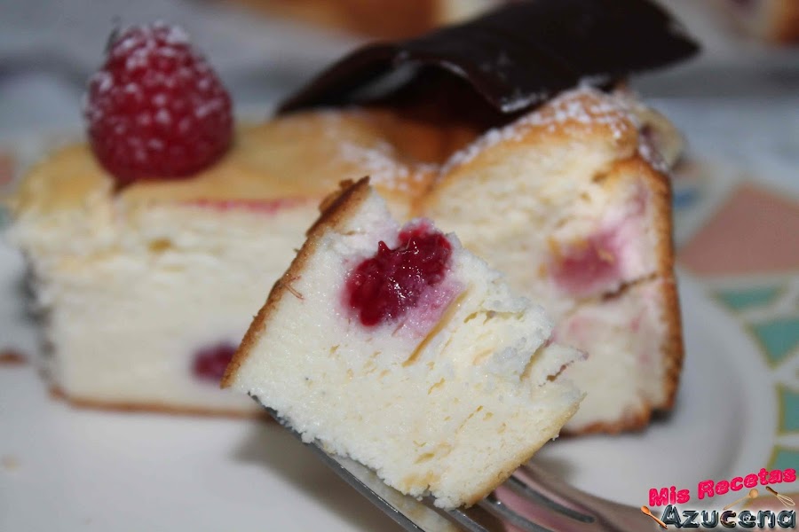 Una vez este frio lo desmoldaremos y le ponemos frambuesas por encimas, espolvoreamos un poco de azúcar glass y podremos hacer unas lascas de chocolate negro.