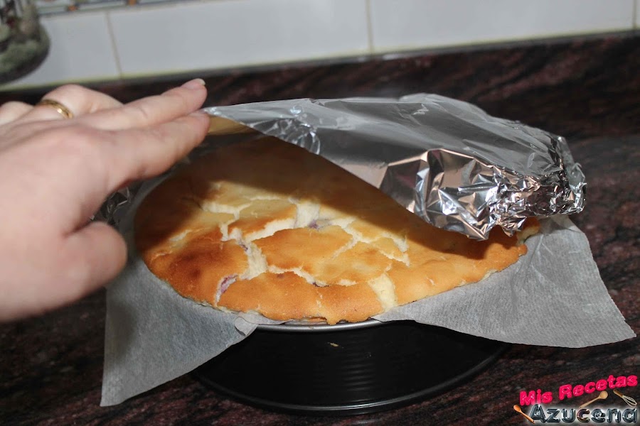 Una vez tengamos las tres capas puestas meteremos el molde en el horno y lo dejaremos cocer entre 75 y 80 minutos, si no queréis que se os dore mucho en los últimos 18 o 20 minutos podéis tapar el molde con papel de aluminio.