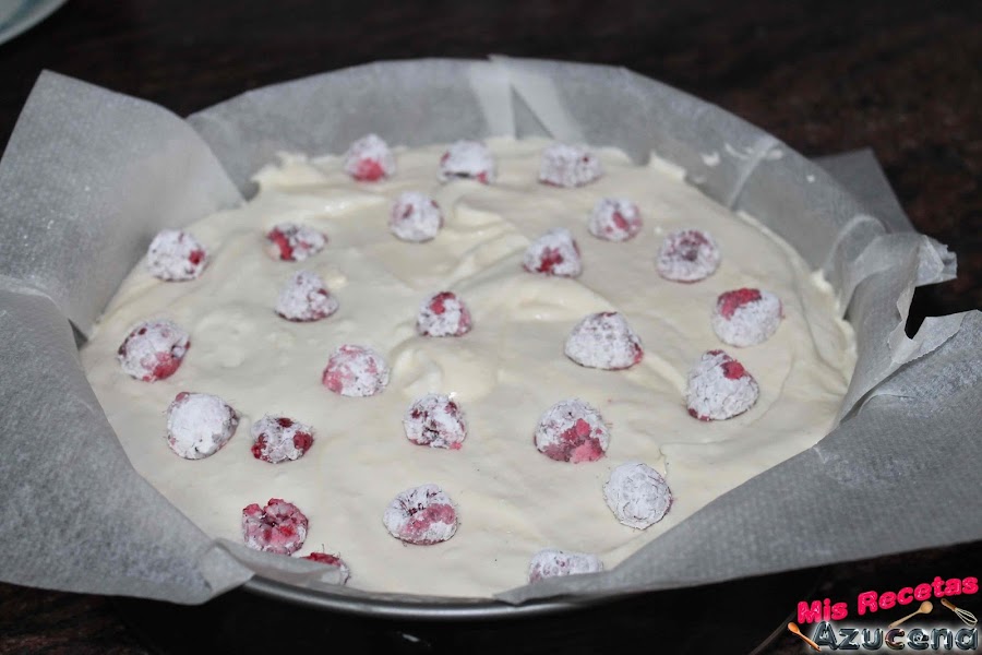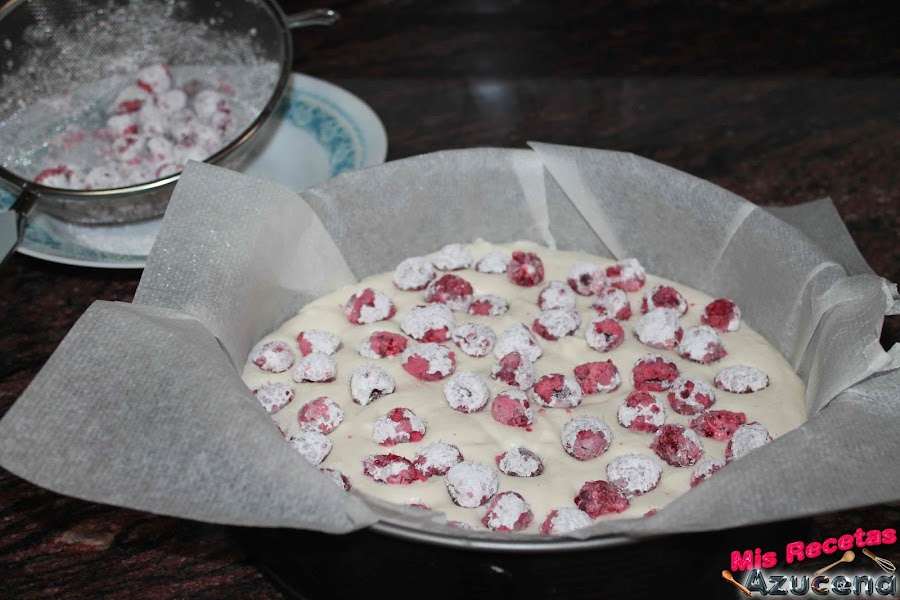 Ahora cogemos el molde que teníamos preparado, con el contenido del bol tendremos que hacer tres capas, ponemos la primera capa encima de esta pondremos una capa de frambuesas, cubrimos con otra capa de masa, volvemos a poner otra capa de frambuesas y por ultimo cubrimos con el resto de masa que nos queda.