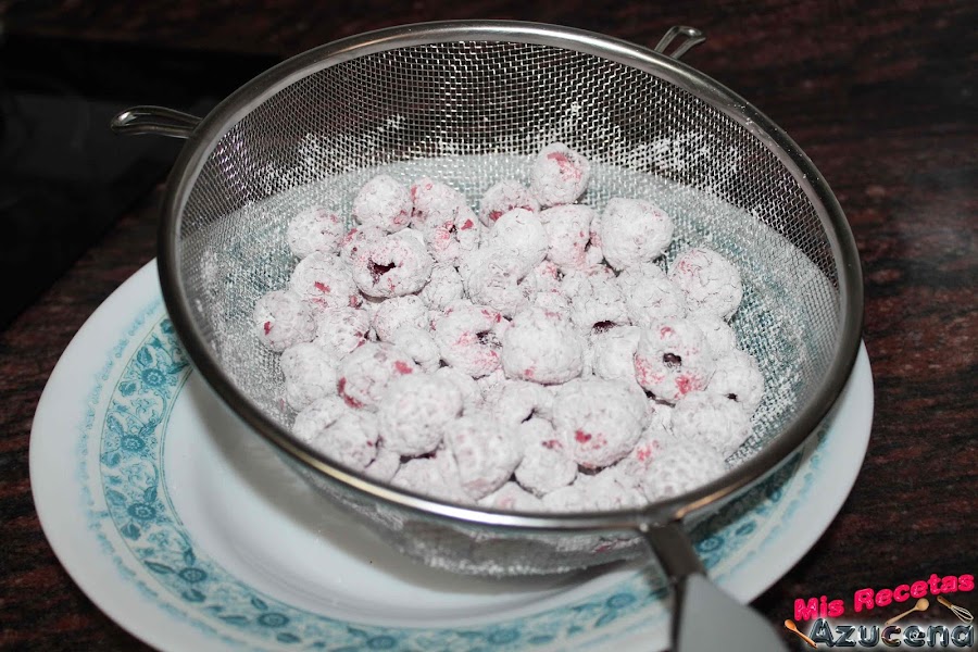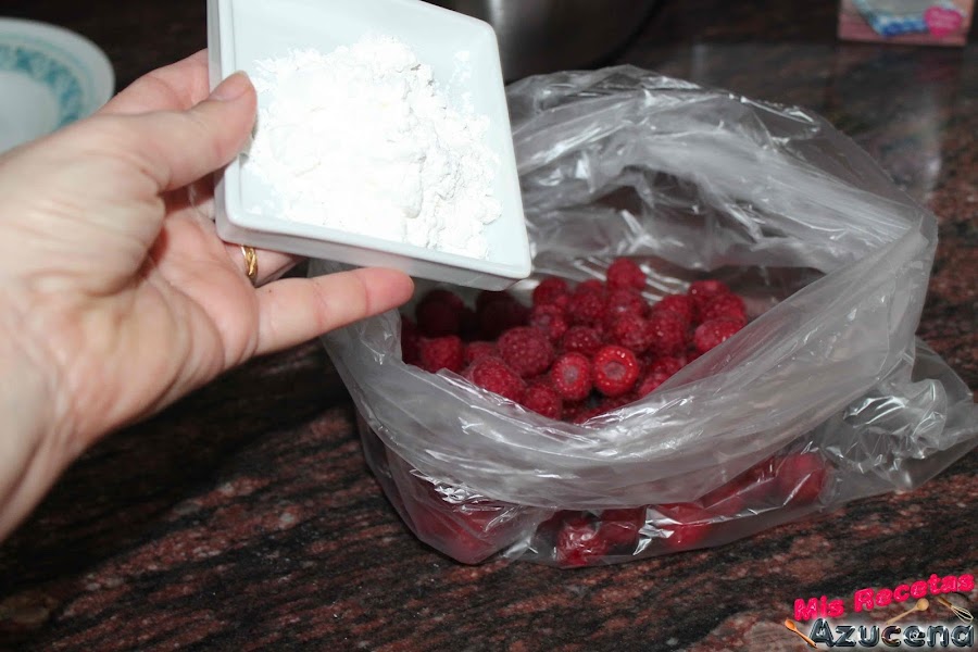 Cogemos las frambuesas, las metemos en una bolsa de plástico y añadimos la maicena, cerramos las bolsa y con cuidado la moveremos para que las frambuesas se impregnen de maicena, una vez listas las pondremos sobre un colador grande y las sacudiremos suavemente para que caiga el exceso de harina, una vez veas que están bien reservaremos.