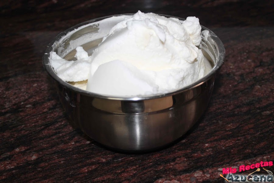 En otro bol pondremos la nata (crema de leche) junto con el azúcar que nos queda reservada, levantamos la nata (crema de leche), reservamos.