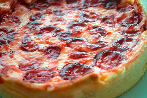 Al servir, diluimos en un cazo un poco de mermelada de fresa con un pelín de agua para hacerla más líquida y pintamos la tarta por encima.