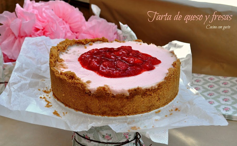 Este mes ha sido mi cumpleaños y preparé dos tartas: una de mousse de chocolate y esta de queso y fresas. Y de esta saque esta preciosa flor.