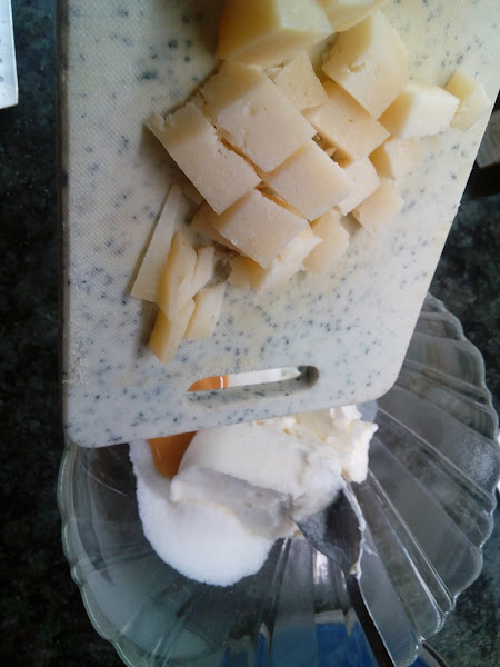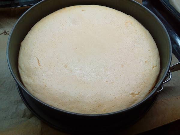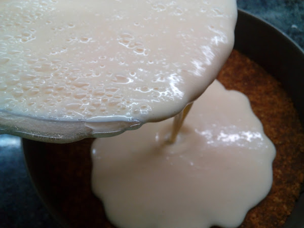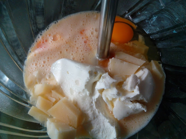 5.- Cuando esté todo batido y homogéneo lo sumamos a la base en el molde e introducimos en el horno previamente calentado a temperatura media (160 grados) unos 30 minutos hasta que esté cuajado el queso.