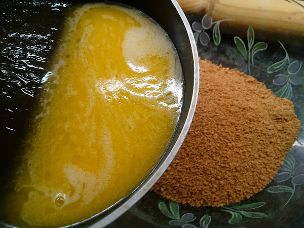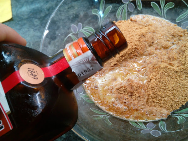 2.- Las vertemos en un cuenco y agregamos 50 grs de azúcar, la mantequilla derretida y un chorreón de licor, mezclamos todo muy bien.