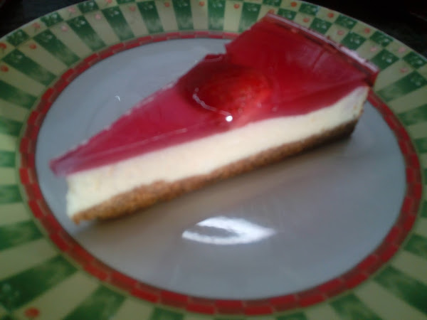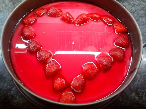 6.- Dejamos enfriar y mientras preparamos las fresas cortadas y una gelatina de fresa para poner de cobertura. Yo dibujé un corazón con las fresas y le eché luego la gelatina antes de que empezara a cuajar. Luego a la nevera unas dos horas hasta que esté bien fría.