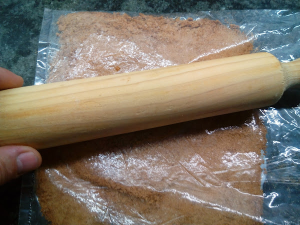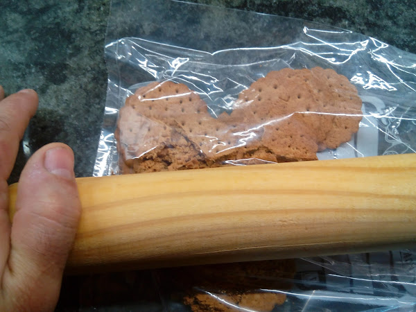 1.- Ponemos las galletas poco a poco en un bolsa gruesa y vamos triturando con el rodillo.