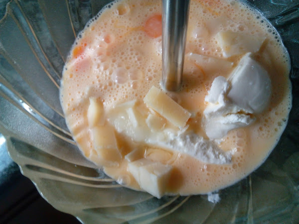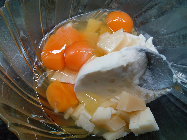 4.- Mientras batimos 4 huevos junto con el resto del azúcar, la leche condensada, los dos tipos de queso y otro poco de licor Cointerau.