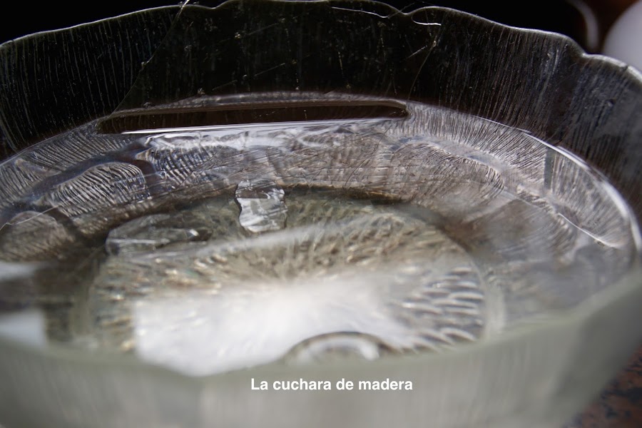 Ponemos las 6 hojas de gelatina en agua fría unos 10 minutos, cuando estén blandas las escurrimos