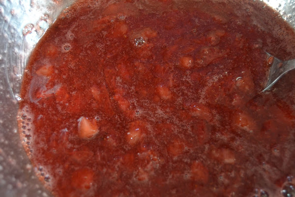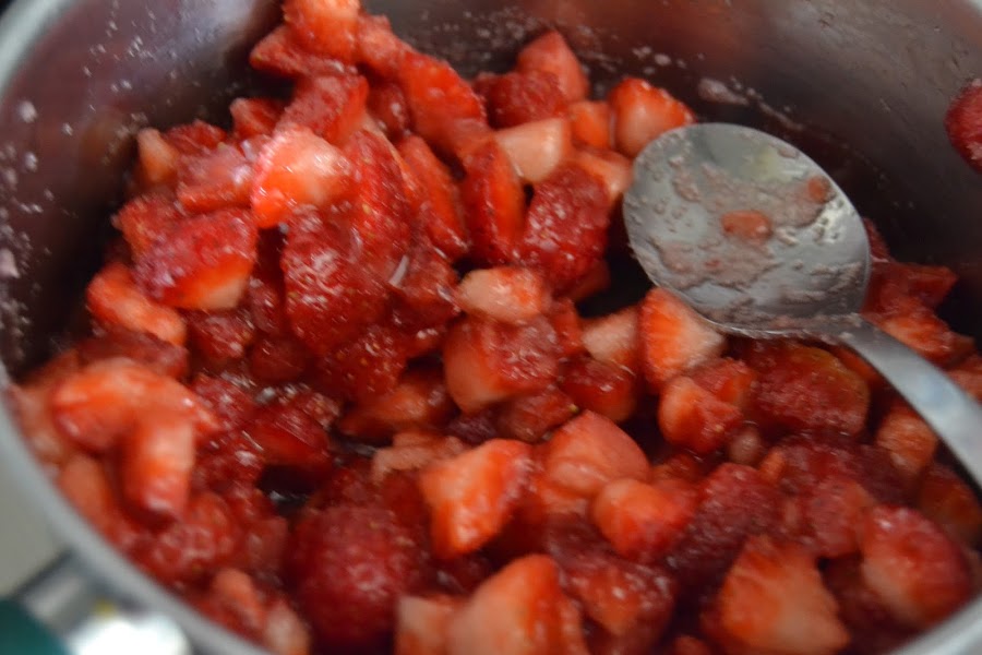 Preparamos el culis de fresas, cortamos los 100 grs de fresas y las ponemos al fuego con los 50 grs. de azúcar, dejamos hervir unos minutos y dejamos enfriar.