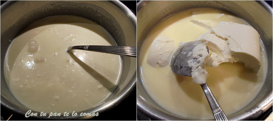 1. Pon a calentar la nata (crema de leche) con el azúcar, a fuego medio y añade el queso. Remueve constantemente hasta que se disuelva en la nata (crema de leche).