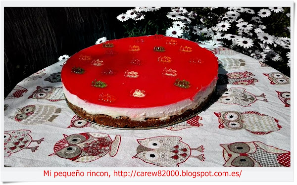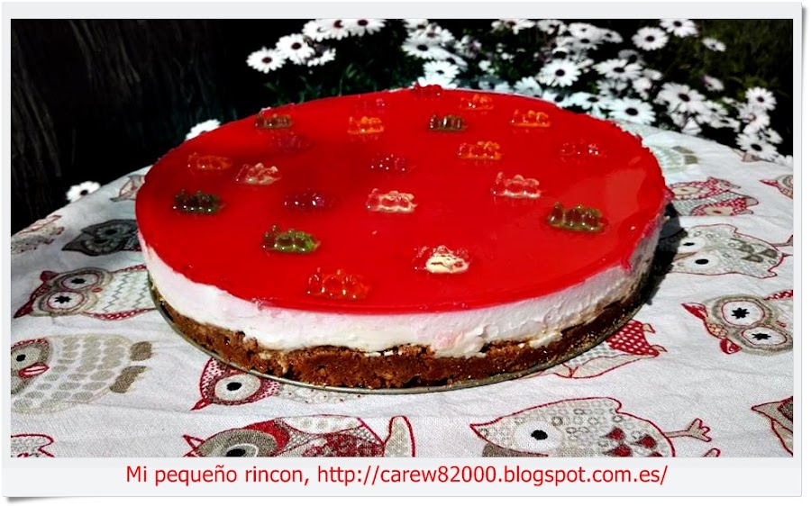 Sacamos la tarta del frigo y echamos la mermelada por encima utilizando una cuchara para que no caiga directamente en la tarta, volvemos a meter en el frigorífico y dejamos 2 horas mas, pasado ese tiempo ya está lista para comer.