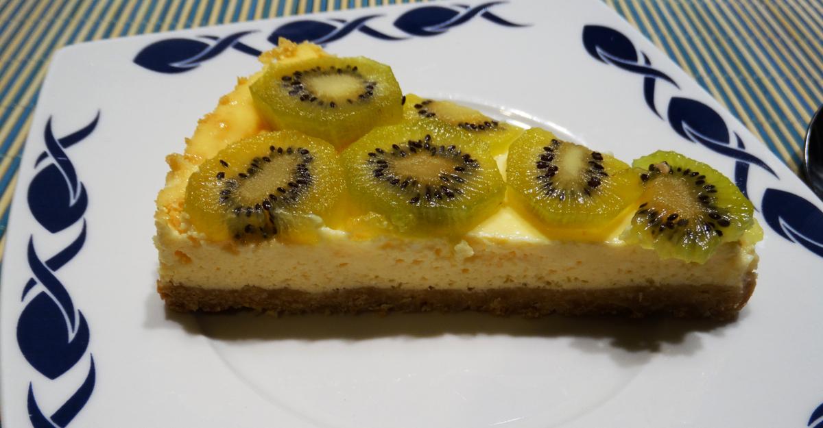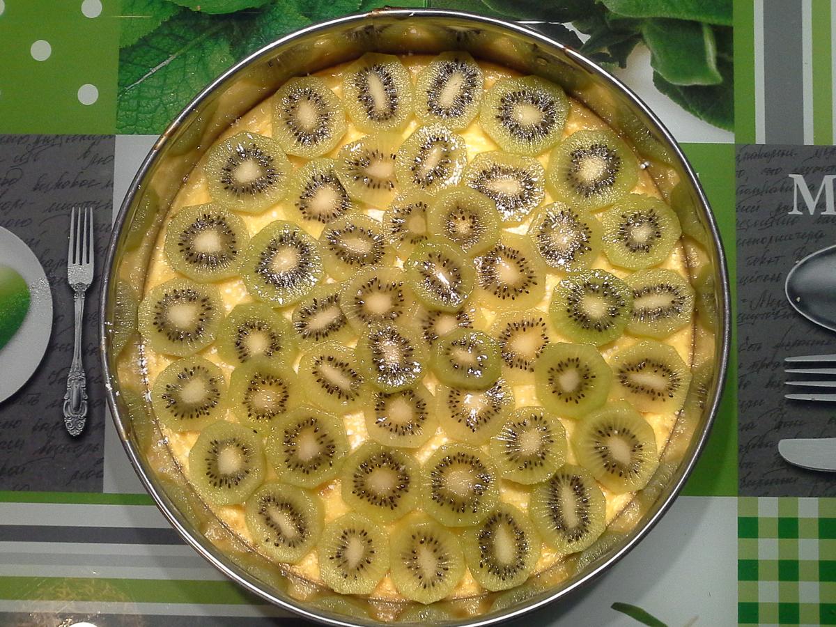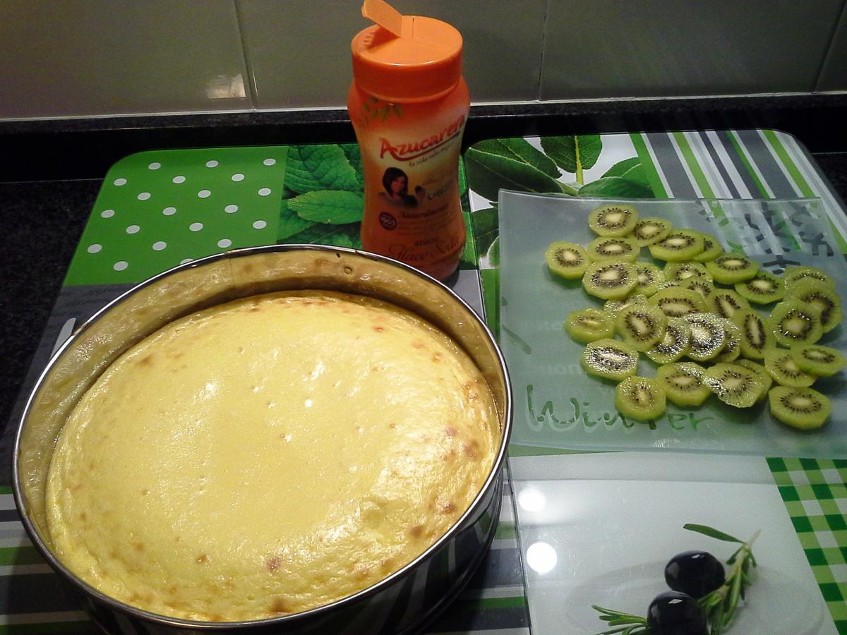Sacamos la tarta del horno y distribuimos por la superficie las rodajas de kiwi. Espolvoreamos con el azúcar glas y dejamos enfriar completamente antes de desmoldar.