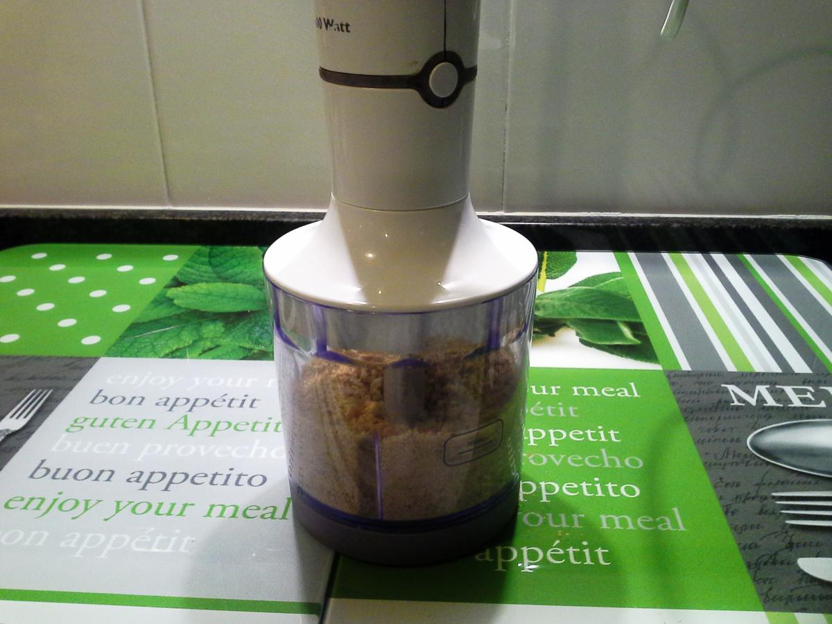 Comenzamos preparando la base de la tarta. Para ello trituramos las galletas y las mezclamos con la mantequilla derretida.
