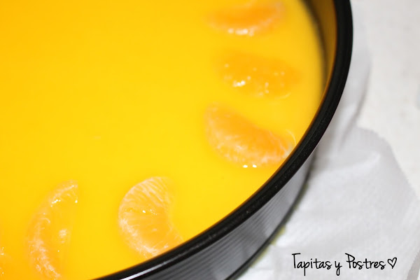 Cuando la tarta esté bien cuajada, preparamos la cobertura. Primero pelamos una mandarina y cortamos gajos, quitando La parte blanca. Los reservamos para adornar.