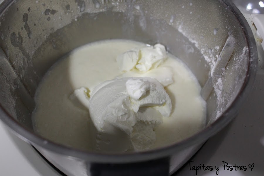 Nos ponemos con el relleno, en el vaso de la thermomix o de una batidora eléctrica ponemos la nata (crema de leche), leche, queso, azúcar, vainilla y cuajada. Mezclamos todo 20 segundos a velocidad 4. A continuación calentamos 7 minutos a 100º y velocidad 4. Si lo hacemos sin thermomix, ponemos la mezcla en un cazo grande y calentamos removiendo constantemente hasta que veamos que la mezcla ha espesado.