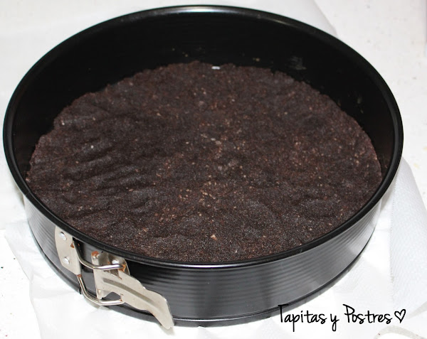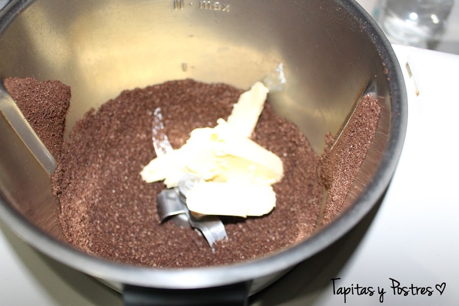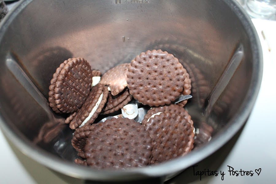 Para la base, trituramos las galletas 5 segundos a velocidad 8. Añadimos la mantequilla y mezclamos 5 segundos a velocidad 5. Vertemos a mezcla en un molde desmoldable y dejamos enfriar en la nevera un rato.