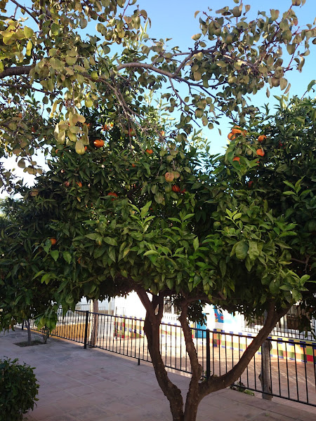 Tenemos un peral, un níspero, un mandarino, un par de naranjos... todos cuajados de frutas que sirven para el desayuno de los maestros y alumnos despistados que han olvidado traer algo para el recreo (que es casi a diario), y a veces con la fruta que sobra hacemos mermeladas con los críos.