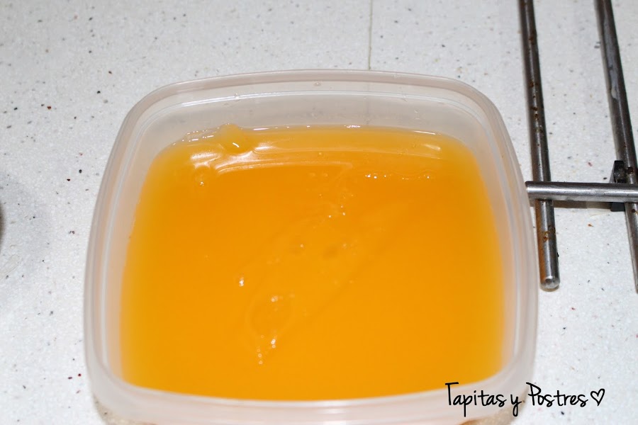 Ahora, exprimimos el zumo de las mandarinas, lo colamos, le añadimos las hojas de gelatina hidratadas y calentamos en el micro unos segundos para que se disuelva bien.