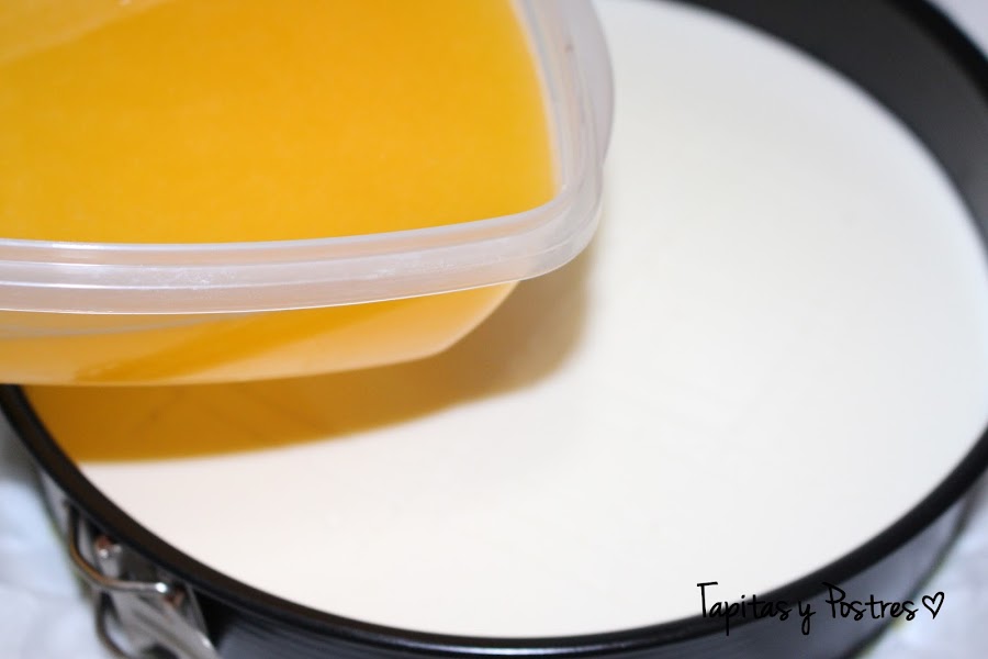 Y vertemos con cuidado sobre la crema de queso, aseguraros de que está bien cuajada.