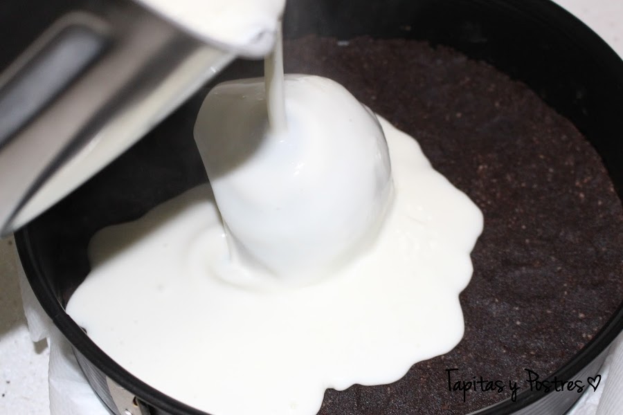 Vertemos la mezcla en la base de galletas. Dejamos que se enfríe para que cuaje la crema. Un par de horas, mas o menos.