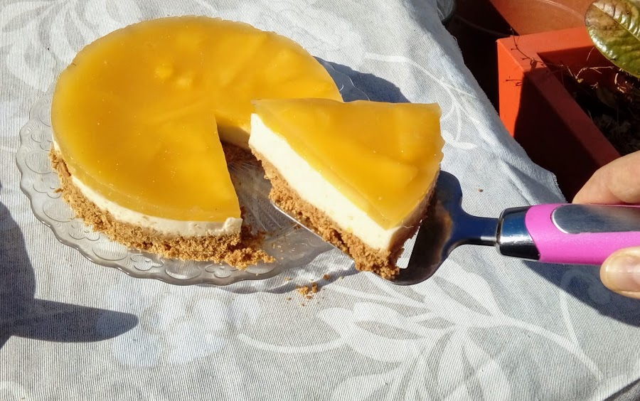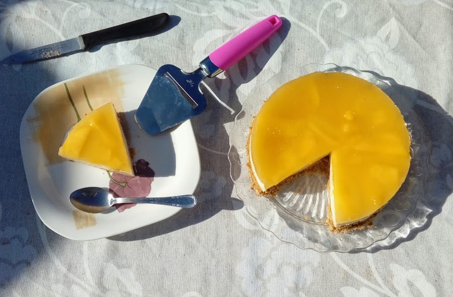 Ponemos los trocitos de mango sobre la tarta y cubrimos con la gelatina de mango, la volvemos a meter en el frigorífico para que se cuaje.