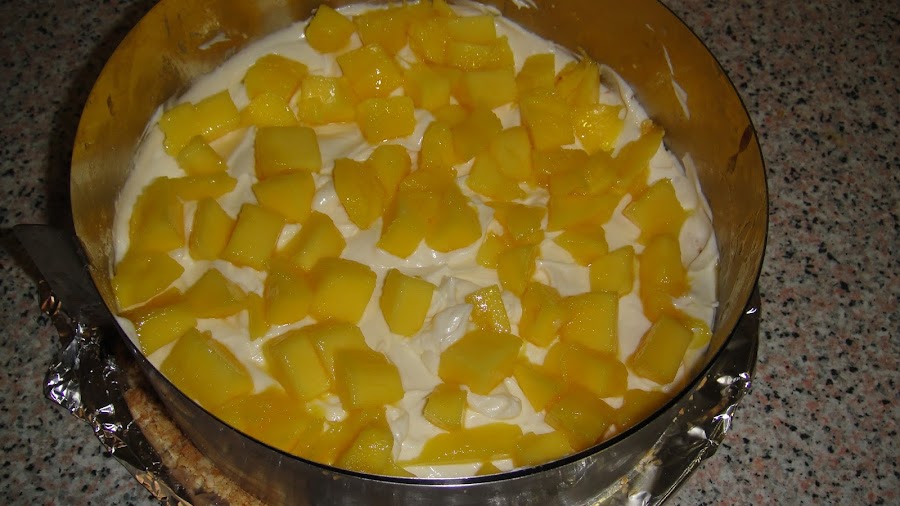 3) añadimos la mitad de la mezcla de queso al molde, y ponemos sobre ella el mango cortado en cubitos.