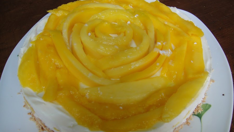 5) para decorar cortamos el mango en finas laminas y vamos colocandolas en forma de rosa sobre la superficie de la tarta.