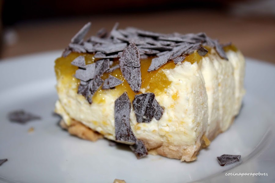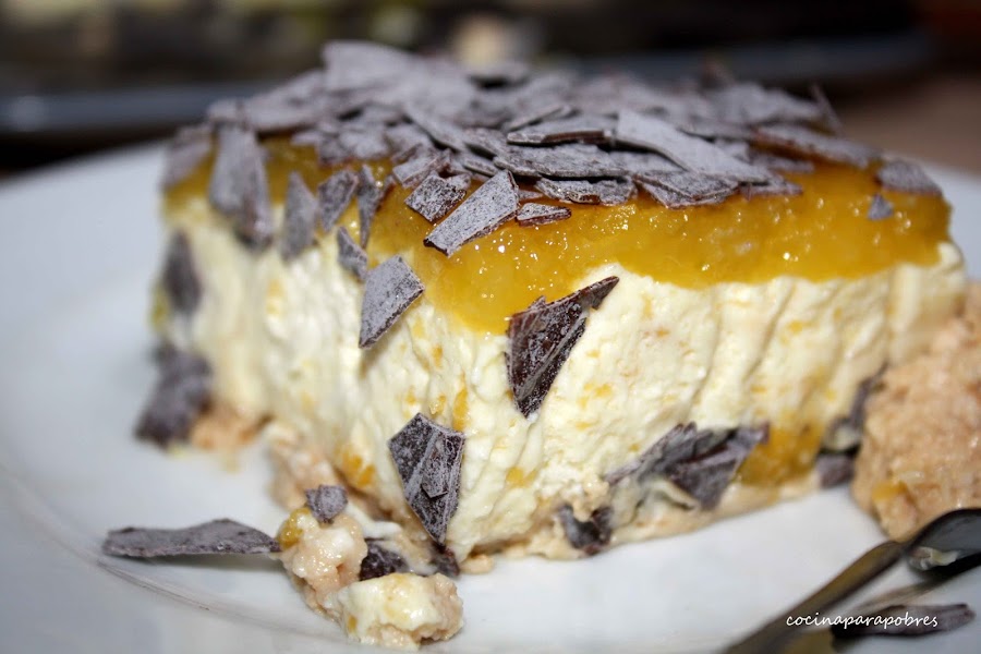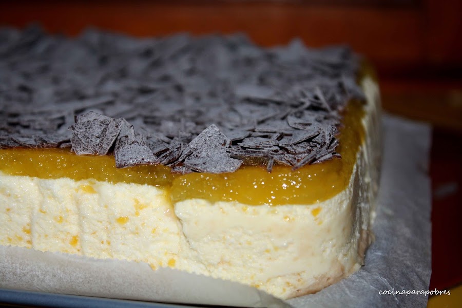 Ponemos las láminas de gelatina en agua. En una olla calentamos el puré de mango junto al azúcar, mezclamos bien y agregamos las láminas hidratadas y escurridas. Mezclamos muy bien y dejamos reposar para que enfríe un poco. Con cuidado vertemos sobre la tarta y volvemos a dejar unas horas en el frigorífico para que cuaje.