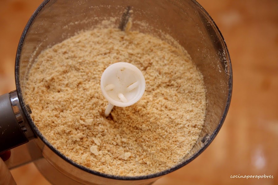 Lo primero que haremos es la base de la tarta, para ello trituramos las galletas y las mezclamos con una cucharada de mantequilla que previamente hemos derretido en el microondas y un poco de leche, mezclamos hasta obtener una pasta. Forramos un molde desmoldable con papel de hornear, extendemos la pasta obtenida por la base y dejamos reposando en el frigorífico mientras seguimos con la elaboración.