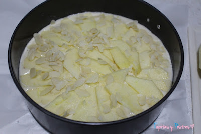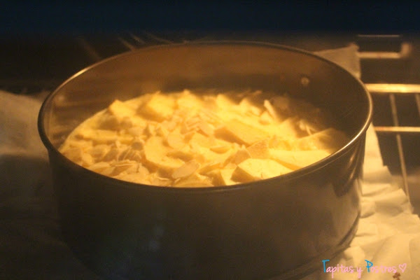 Vertemos la masa sobre el molde con la base de galletas. Colocamos encima las otras dos manzanas en láminas y espolvoreamos con almendras laminadas.