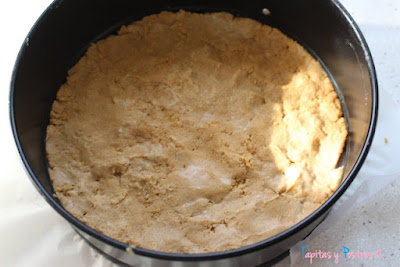Ponemos la mezcla en el fondo de un molde desmoldable forrado con papel vegetal. Guardamos en la nevera una media hora.