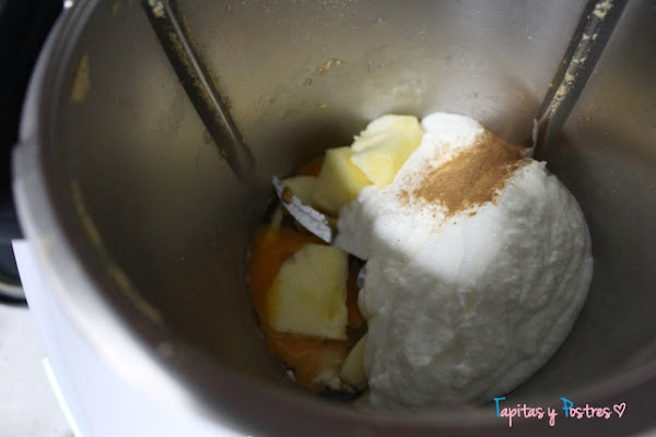 Echamos las dos manzanas, huevos, leche, azúcar, canela y queso batido. Batimos 30 segundos a velocidad 4. Debe quedar una crema homogénea, si no es así volvemos a batir.