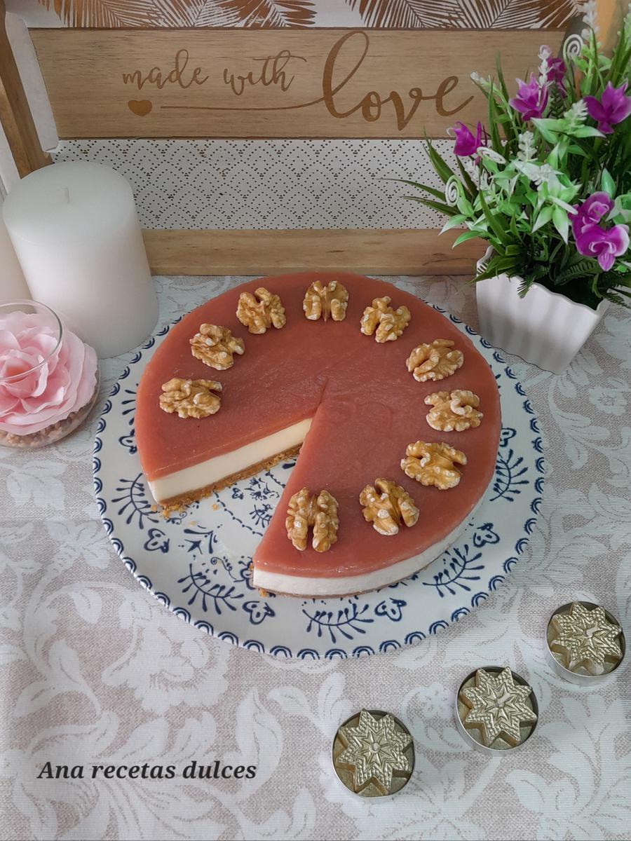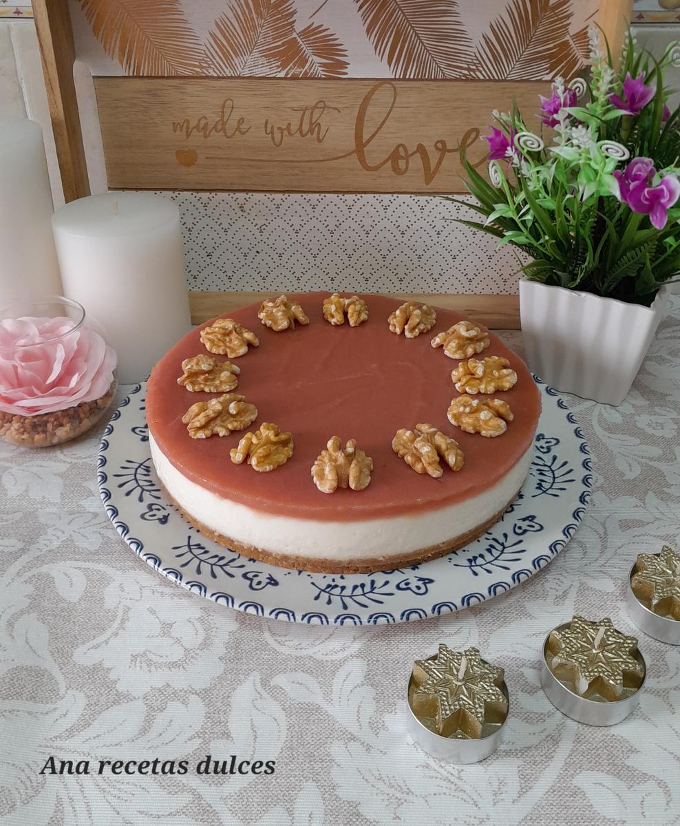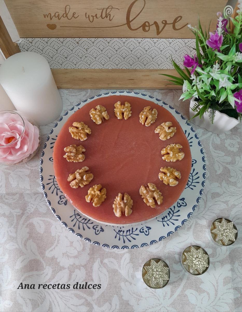 Al día siguiente, desmoldamos y decoramos a nuestro gusto, yo la he decorado con unas mitades de nueces que le va genial al dulce de membrillo.