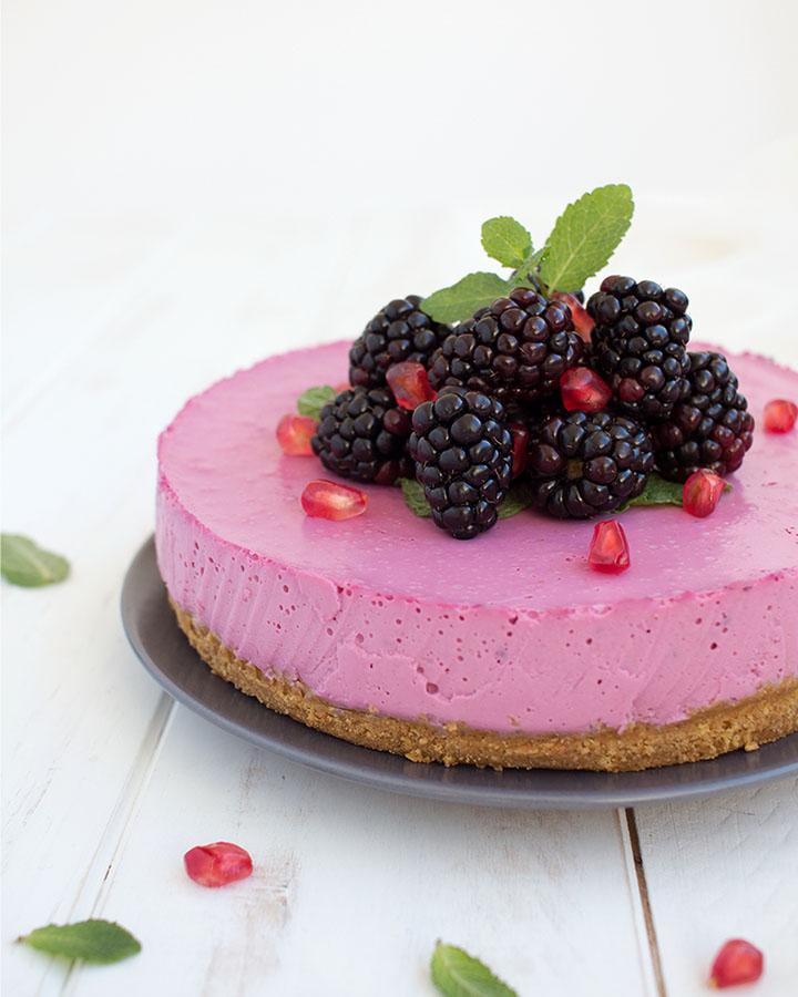 Saca la tarta del molde y decórala como más te guste. A mí me encanta con moras, granada y hojas de menta. ¡Aguanta hasta 3 días en la nevera perfecta!