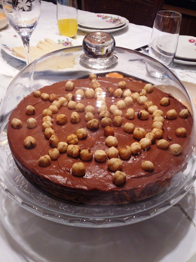 Sacar el molde de la nevera y verter cuidadosamente la crema de Nutella sobre la galleta, extender con una cuchara o espátula y decorara con el resto de avellanas picadas (yo las puse enteras porque había gente que no las podía comer)