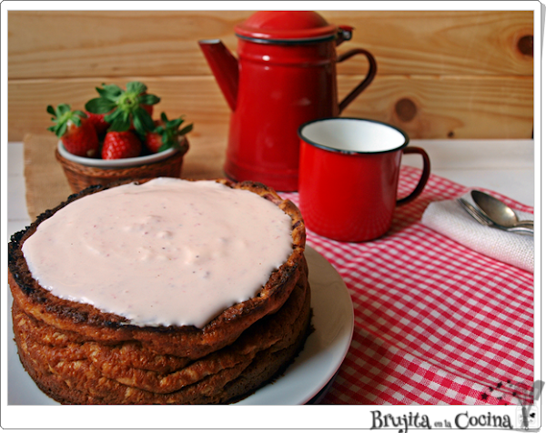 Mientras se enfria la tarta vamos a preparar una crema para acompañar. Primero batimos las fresas limpias y en trozos para facilitar el batido junto con la leche condensada con una batidora de brazo. Reservamos. A parte montamos la nata (crema de leche) junto con el queso hasta que tenga consistencia, le añadimos la crema de fresas con la ayuda de una lengua lo mezclamos bien. Introducimos en el frigo al menos 30 minutos, después tras desmoldar la tarta cubrimos con la crema.