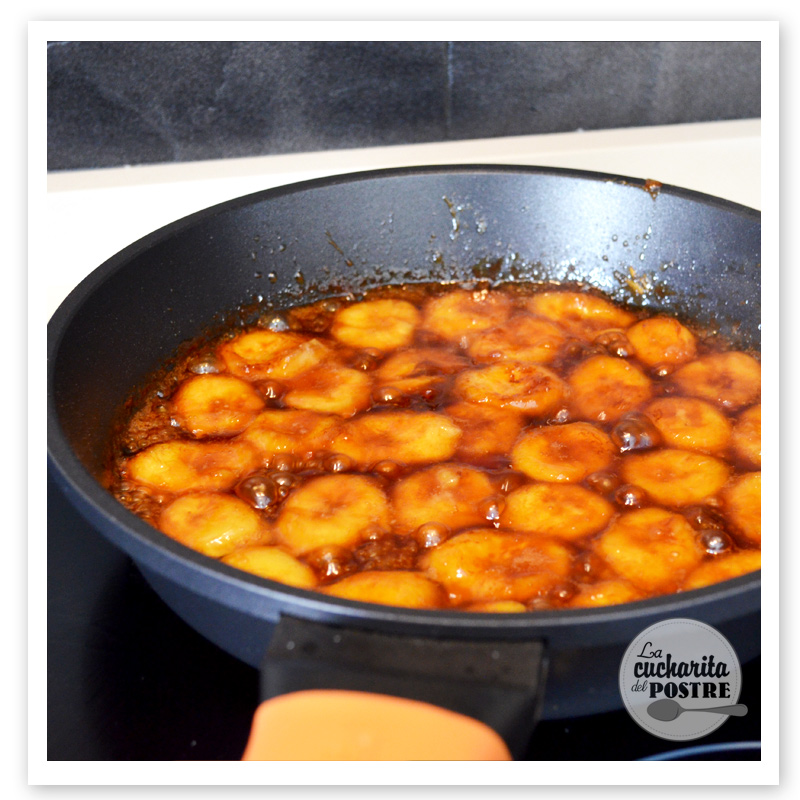 3. Pon las rodajas de plátano dentro y cocínalas hasta que estén caramelizadas. Cuando estén listas por un lado, dales la vuelta.