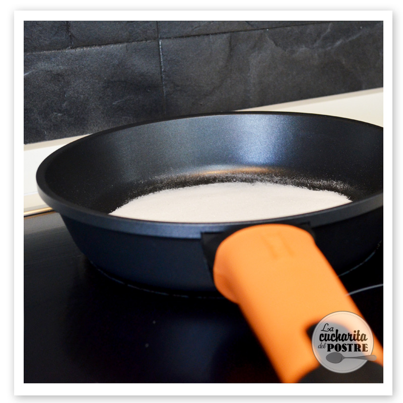 1. Pon el azúcar en una sartén antiadherente a fuego medio y deja que ésta se empiece a caramelizar.