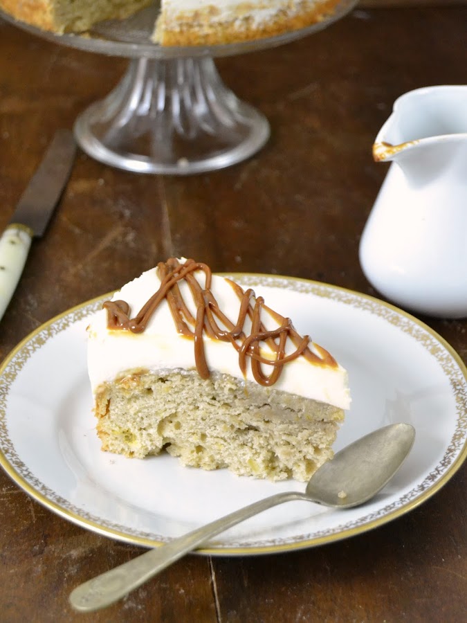 10.- Desmoldaremos la tarta y la decoraremos con lo que más nos guste, plátano o cualquier otra fruta cortada, chocolate rallado... Nosotros le hemos puesto unos hilos de dulce de leche que combina muy bien con el plátano y el queso.