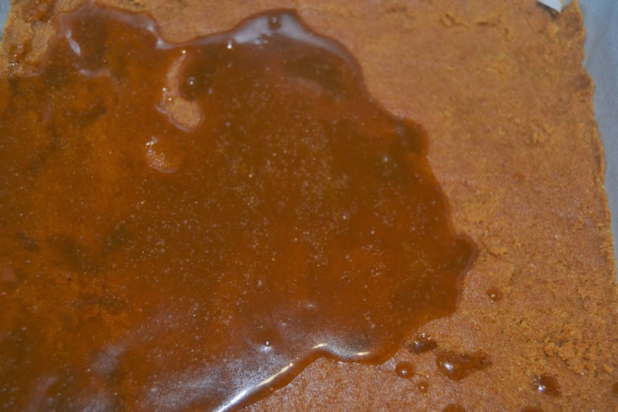 A la base de galletas le ponemos encima una capa de salsa de toffe y a continuación echamos encima la crema de queso.