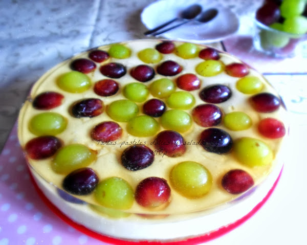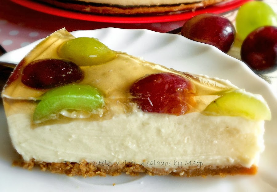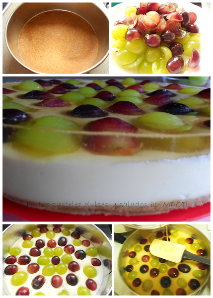 Como el ingrediente elegido por Isabel la anfitriona de este mes me ha gustado mucho, tanto por su sabor como por sus propiedades, no he dudado hacer y aportar esta rica tarta de queso y uva al moscatel que encontré hace años en el blog de María Lunarios.