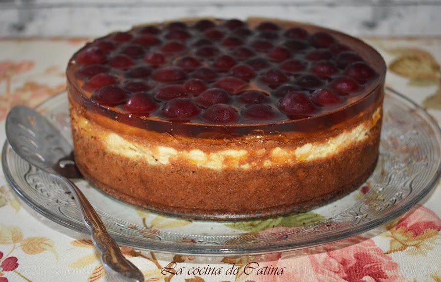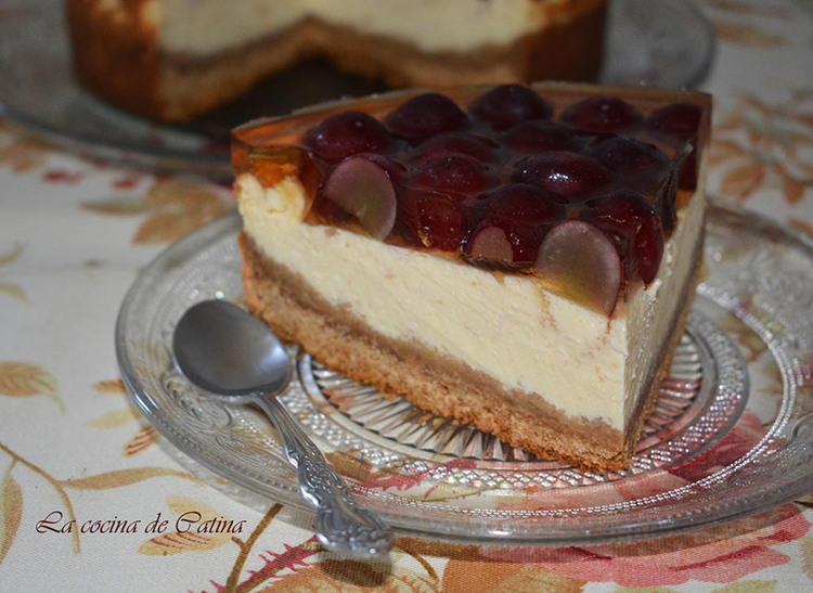Apagamos el fuego y añadimos la gelatina escurrida, removiendo hasta que se disuelva. Vertemos sobre la tarta, cubriendo las uvas y la dejamos reposar en el frigorífico al menos 3 o 4 horas.