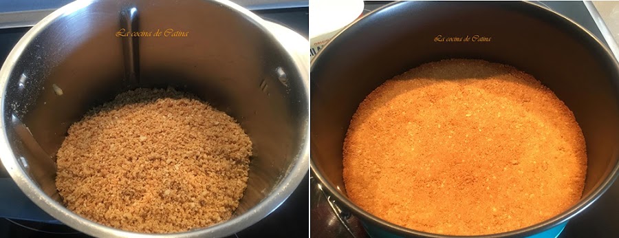 Precalentamos el horno a 180 grados.Para preparar la base, trituramos las galletas y las mezclamos con la mantequilla ablandada y la almendra. Cubrimos con esta masa el fondo de un molde desmontable de tartas, formando una capa de 1/2 centímetros. Cocemos en el horno durante 15 minutos, sacamos y reservamos.