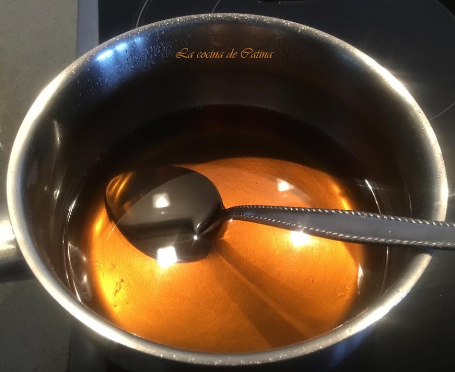 Dejamos la gelatina en remojo en agua fría durante 5 minutos. Llevamos a ebullición en un cazo 150 mililitros de agua con el vino y el azúcar, cociendo hasta que se reduzca a la mitad.